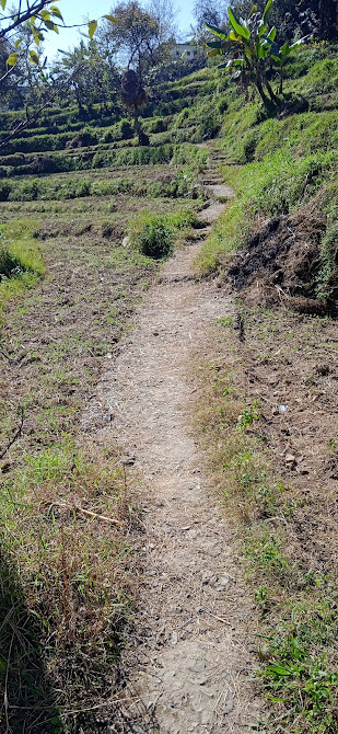 कुछ देर बाद खेत पर गए| रमणीय पगडण्डी और माहौल! इस खेत का अदू ने बहुत लुत्फ उठाया| बल्की यहाँ की हर चीज़ उसे पसन्द आ रही है, क्यों कि यहाँ पर सब बिल्कुल नया और पसन्द आने जैसा ही है| यहाँ आने के कारण वह थोड़ी कुमाऊनी भी सीख कर आई है| यहाँ की भाषा में लेकीन एक मज़ेदार मामला हो रहा है! अदू मुझे इन दिनों "निन्नू" के नाम से पुकारती है| और यहाँ की भाषा में निन्नू का अर्थ छोटे बच्चों को सुलाने का शब्द (नीन्दिया आजा रे जैसे) है! इसलिए जब अदू मुझे निन्नू कह कर पुकारती है, तब यहाँ की महिलाओं को बहुत ही अटपटा लगता होगा! खैर!