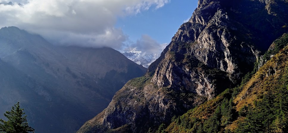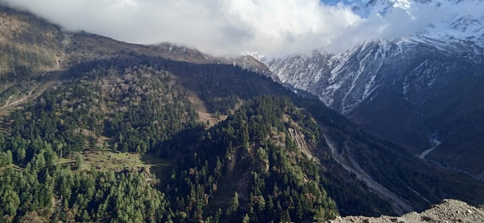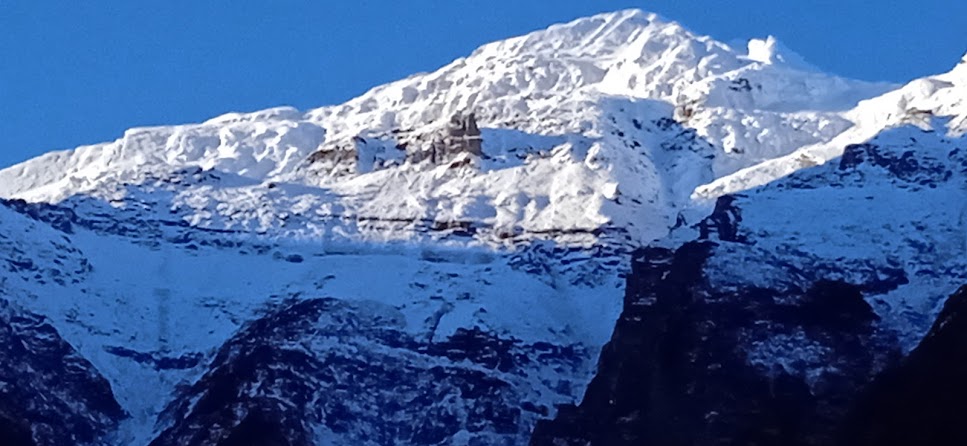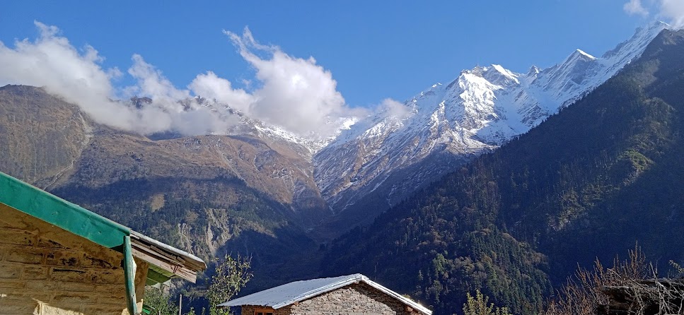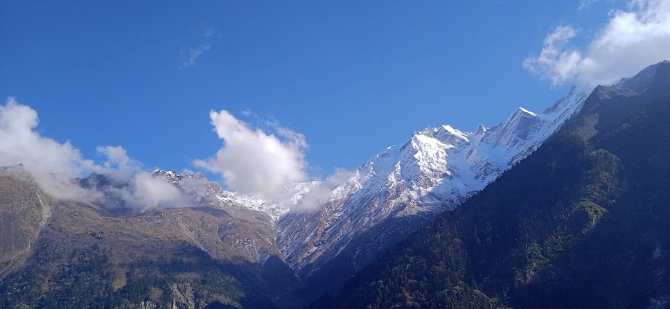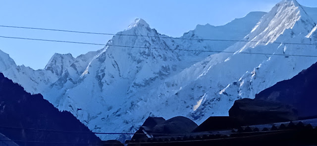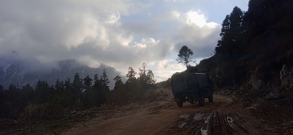 एक जगह पर मिलिटरी का एक युनिट मिला| वहाँ चाय के दुकान भी दिखे| थोड़ी सी बस्ती है| कुछ देर वहाँ रूके| हमारे मित्र और जितू जी वहाँ के जवानों से मिले| उनके यहाँ सिविलियन्स के लिए कुछ सुविधाएँ थी| फिर उनसे कुछ बातचीत हुई| बाद में उन्होने ही हमें चाय- कॉफी दी| सशस्त्र सीमा बल का यह युनिट| यहाँ की ऊँचाई २७०० मीटर्स! अर्थात् हम जिसे 'महा ऊँचाई' कहा जाता है, उस ऊँचाई के पहले स्तर तक आ गए हैं| यहाँ से यह यात्रा और कठिन होती जाएगी| साथ में होनेवाले किसी किसी को तकलीफ शुरू भी हुई| फिर उन्हे मेरे ट्रेकिंग- साईकिलिंग के अनुभव के आधार पर सचेत भी किया| यहाँ आते आते प्रकृति ने इस तरह करवट ली है कि यहाँ के कुत्ते में भी घने बाल है| ठण्ड के लिए प्राकृतिक इन्तजाम! कुछ देर वहाँ रूके और वहाँ के नजारे फोटो में ले कर आगे निकले| अब हिमशिखर बिल्कुल सामने दिखाई दे रहे हैं|