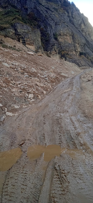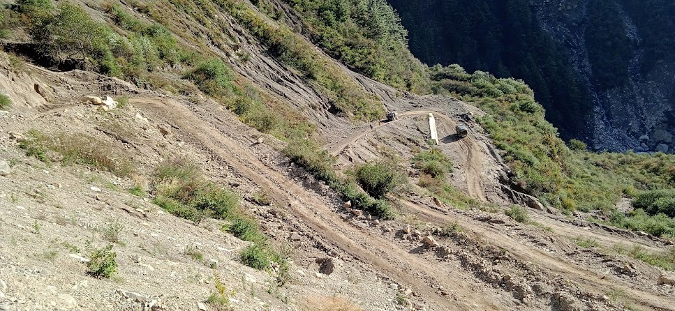 यहाँ से बड़ी तेज़ चढाई शुरू हुई| शायद इस रूट की सबसे तीव्र घाट जैसी चढाई| वाकई यहाँ जाना एक रोमांच है| यहाँ जीप चलाना बेहद नामुमकीन जैसा है| और चलानेवाले ड्रायवर बहुत तजुर्बेकार है, इसका बड़ा सुकून मिल रहा है| बीच बीच में इतनी तेज़ चढाई और तुरन्त मूडनेवाली सड़क! साथ ही कई जगहों पर संकरी सड़क जिससे वाहन क्रॉस हो रहा हो तो आगे- पीछे जना होता है| मैने खुद महाराष्ट्र में फोरवीलर चलाई है, लेकीन यहाँ ड्राईव करने का विचार भी मै अफॉर्ड नही कर पा रहा हूँ! यह मामला ही अलग है! जैसे वास्तव में दुर्गमता खड़ी है! स्पीति में साईकिल चलते समय दुर्गा, दुर्गमगा, दुर्गमस्थाना ऐसे दुर्गमता के नाम याद आए थे! यह सड़क वही अनुभव दोबारा दे रही है| जितूजी ने बताया कि इस सड़क पर फोर बाय फोर गाडी ही चाहिए| अर्थात् जिस गाडी के पीछले दो पहिए भी खुद की गति होनेवाले होते हैं| हमारी बोलेरो बिल्कुल कमजोर लग रही है| साथ में होनेवाले मूल चालक (जो उसके मालिक भी है) बोले कि नई बोलेरो में पहले की बोलेरो जैसा पिक अप भी नही है! इसलिए वह उतनी तेज़ी से चढती नही है| लेकीन जितूजी बड़े जिगर से गाडी ले जा रहे हैं| हमारे साथ के एक सर बार बार 'मारना' शब्द का इस्तेमाल करते हैं| जैसे खाने के समय 'पाव भाजी' मारी, रिचार्ज 'मारा', नैनिताल 'मारा' आदि! वैसे ही यहाँ जितूजी गाड़ी बिल्कुल मार ही रहे हैं! और इस सड़क ने भी हम सबको लगभग "मार डाला" है! कितने सही समय पर वे हमसे जुड़ गए, हमें बहुत खुशी हो रही है| लेकीन यह खुशी ज्यादा देर नही चली! क्यों कि उनकी अपनी और एक गाडी भी थी और वह पीछे से आ रही थी| उन्होने और एक ड्रायवर को ट्रेनिंग के लिए वह चलाने को दी थी| पर एक मोड़ से दिखाई दिया कि वह चढ़ ही नही रही है| इसलिए कुछ देर तक प्रतीक्षा करने के बाद जितूजी निकले| उन्होने कुछ निर्देश हमारे ड्रायवर को दिए| बेचारा राजी हुआ चलाने के लिए! डर तो उसे भी था ही| लेकीन डर से अधिक गाडी की फिक्र है| लेकीन उनकी गाड़ी फंस गई थी, तो उन्हे जाना ही पड़ा| उनके पहचान के कई ड्रायवर्स यहाँ है| इस कारण उनके पास एक वॉकी टॉकी भी था| उस पर वे बीच बीच में 'चार्ली वन चार्ली वन' कह कर बात करते थें| निकलते समय वे उसे गाड़ी में छोड़ कर ही चले गए|