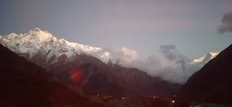 हिमालय के इतना अन्दर तक आने के लिए सच में किस्मत होनी चाहिए| इतना अन्दर और वह भी मानस सरोवर रूट पर! किस्मत में न हो, तो यह मुमकीन नही होता है| इतना भव्य हिमालय और उसका इतना सत्संग! ऐसी विराट प्रकृति नतमस्तक करती है, हमारे अहंकार को पीघला देती है| जो ध्यान नही करते हैं, उनके कहने में भी आया कि हम जो साथ यहाँ जा रहे हैं, उनमें कुछ पूर्व जन्म का नाता होगा, उसके बिना हम यहाँ साथ नही आते! और ऐसे माहौल में जीप में पहाड़ी गानों में एक गाया यह भी है- तेरो मेरो रिश्तो पहले जनम वा' ऐसा ही कुछ! ऐसा चलते चलते अन्धेरा होने ल्गा और जब तब भी गूंजी नही आया, तब डर के मारे ॐ नमोs शिवाय गाना भी बजा| दूर कुछ बस्ती जैसा दिखाई दे रहा है और मोबाईल टॉवर भी दिखाई दे रहा है| गूंजी ही होगा यह! लेकीन वह पास नही आ रहा है| आगे जाने पर और पहाड़ और दूरी नजर आती है| गूंजी में एक यात्रा है और इसके लिए कई गाडियाँ वहाँ जा रही हैं| इस कारण सड़क पर थोड़ी तो यातायात है|