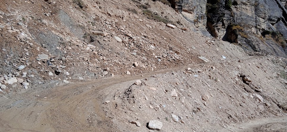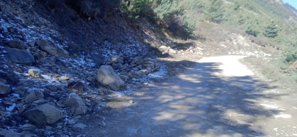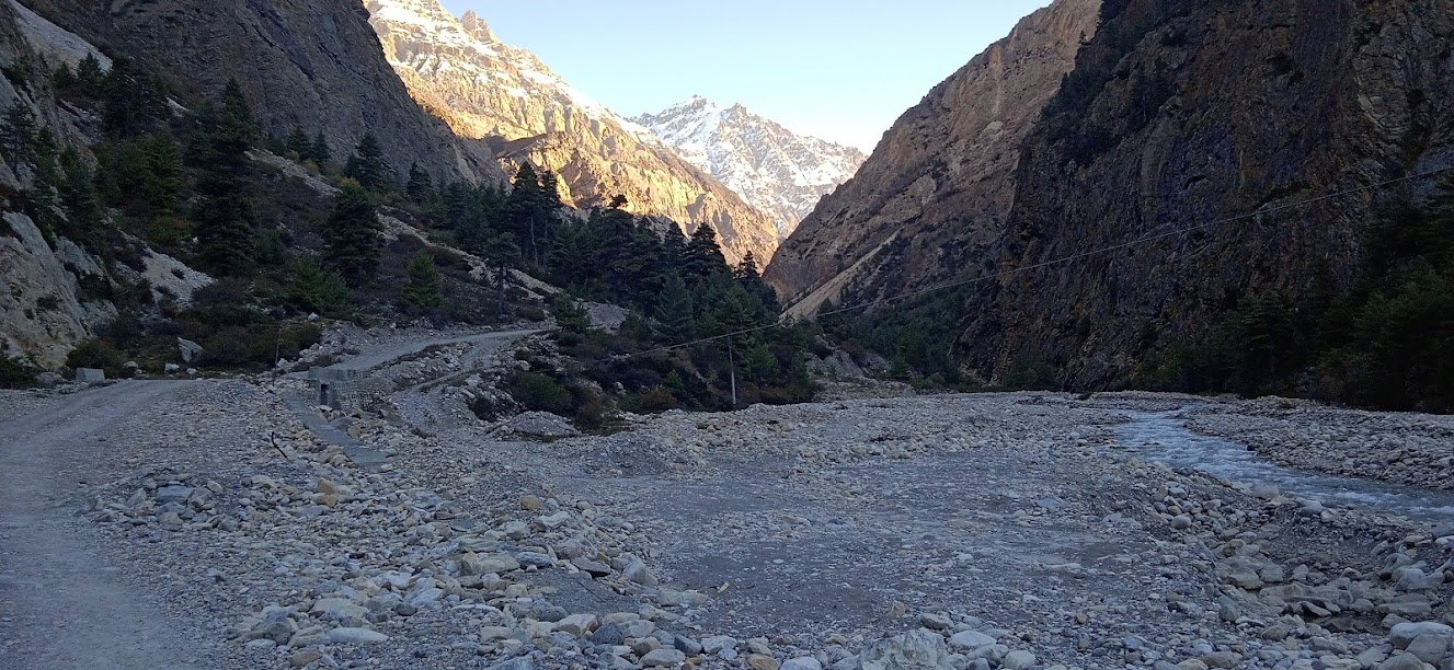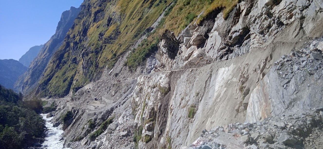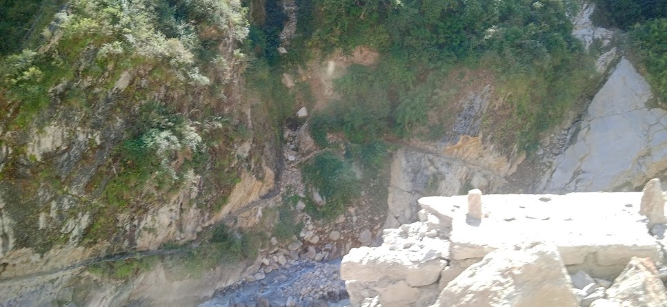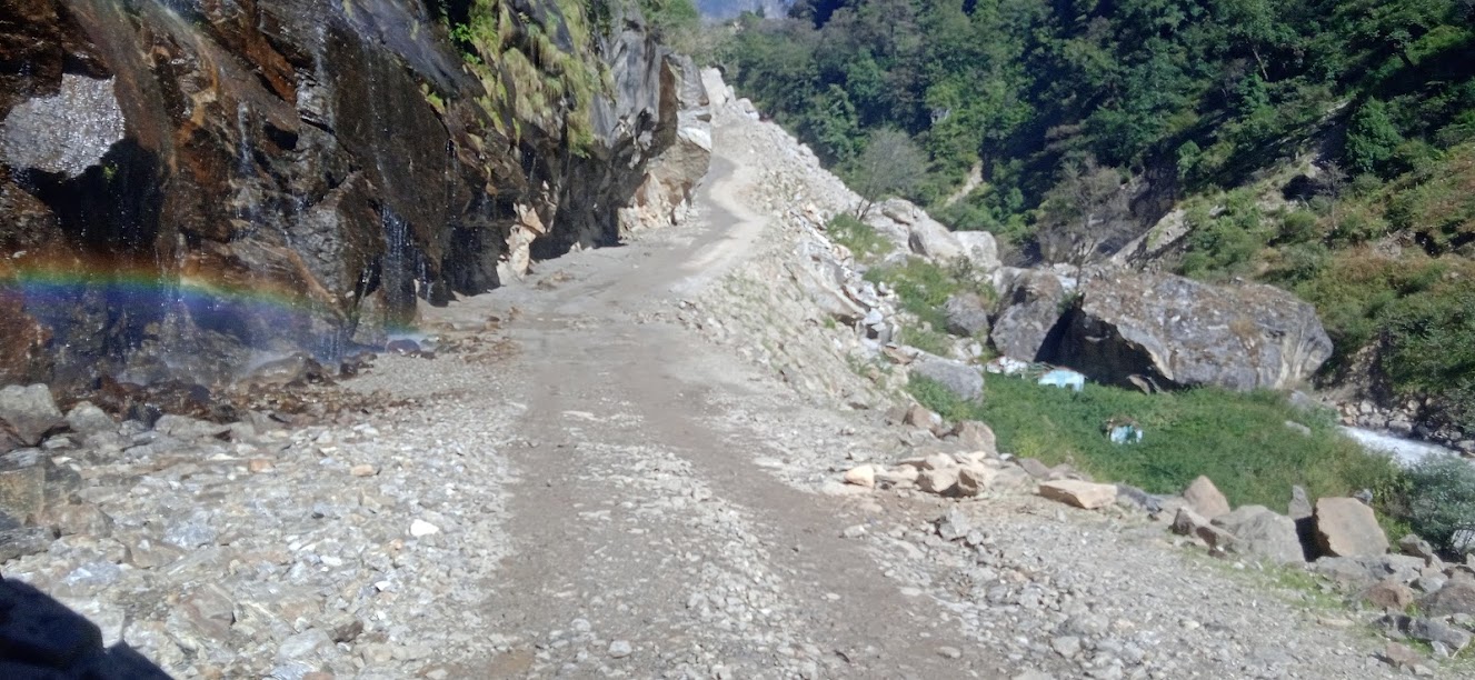 आगे भी कई बार "ओह शट्ट!" ऐसा मन में आता रहा| लेकीन गाड़ी फंसने की नौबत नही आई| एक बार सब नीचे उतरे और उसी ड्रायवर ने गाड़ी उड़ायी| इससे अतिरिक्त गाड़ी को और कोई मुसीबत नही आयी| सौभाग्य से उसके सभी पूर्जे ठीक रहे| सिर्फ नीचला हिस्सा मामुली रूप से क्षतिग्रस्त हुआ| बाकी सड़क भी उतनी ही रोमांचकारी थी| लेकीन धीरे धीरे सूकून मिलता गया कि चलो, अब तो यह सड़क खतम हो रही है| फिर एक बार सड़क के झरने लगे, इन्द्रधनुष्य भी मिला! धीरे धीरे ऊँचाई कम होती गई और सूरज उपर उठता गया और तब ठण्ड का प्रकोप कम हो गया| काली गंगा फिर से बड़ी होने लगी! इस नदी की बाल अवस्था से यौवन अवस्था हमें देखने मिली| पास की प्रकृति का रंग भी हरा होने लगा| तवा घाट के लगभग छह- आंठ किलोमीटर पहले नेपाल की तरफ काली गंगे को समानान्तर पगडण्डी दिखाई दे रही हैं! निश्चित ही यह अतीत की एक मुख्य पगडण्डी होगी, कोई मुख्य रूट होगा! अब भी उसके पत्थर ठीक दिख रहे हैं| कई बार ठीक नदी के पास आकर वह पगडण्डी वापस पहाड़ में चढती है और आगे बढ़ती है| तवाघाट में भी वह पगडण्डी दिखी!