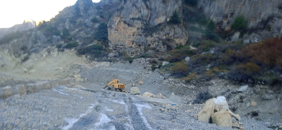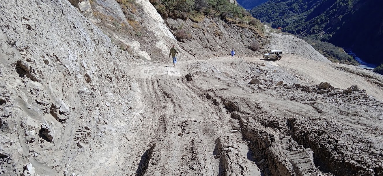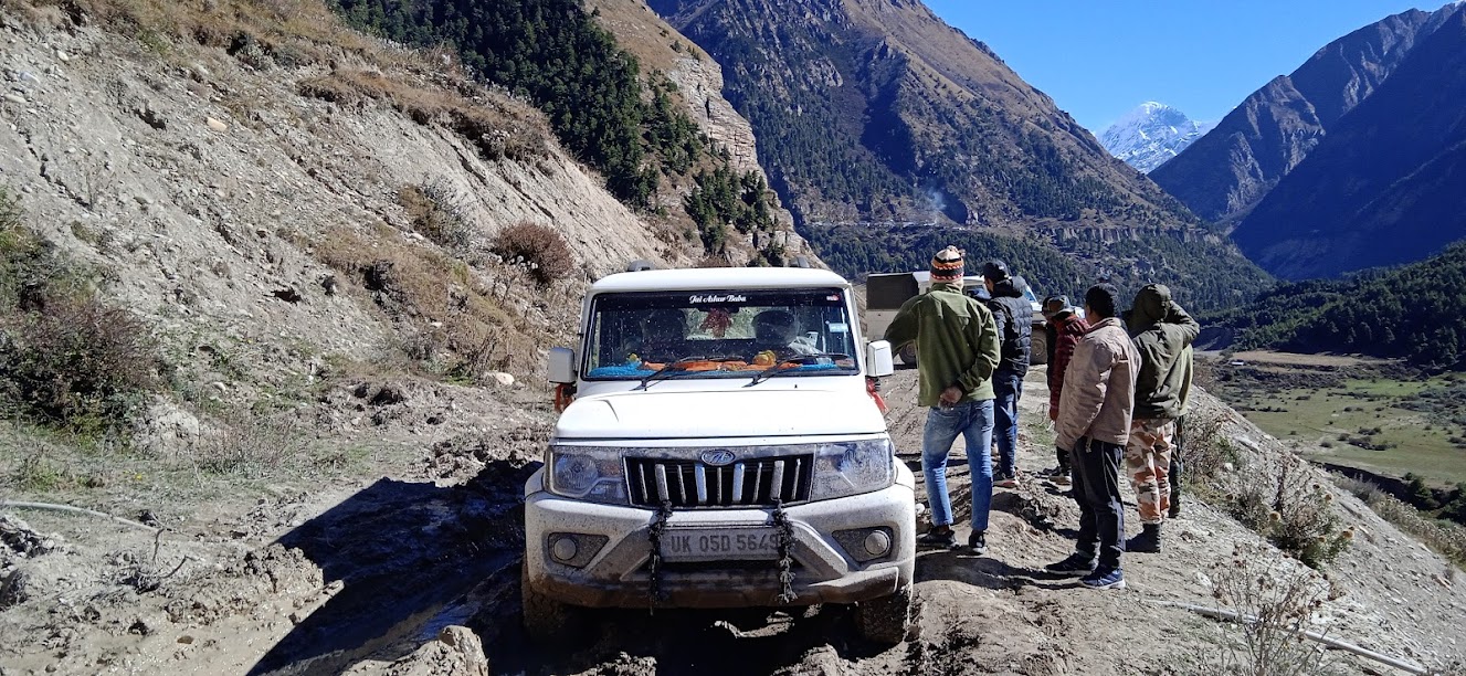 वापस लौटते समय गूंजी में कल जिस होटल में चाय ली थी, वहीं पर आलू पराठा और चाय का बढ़िया नाश्ता किया| गज़ब की बात, यहाँ कुछ साईकिलवाले दिखे! लेकीन पूछताछ करने पर पता चला कि वे गूंजी में ही घूम रहे हैं और गाड़ी से ही साईकिलें लाए हैं! यहाँ साईकिल या अन्य कोई भी वाहन के बजाय पैदल चलना ही सेफ हैं! ना हाथी ना घोड़ा, यहाँ बस पैदल ही जाना है! अभी अच्छी धूप खिली है| इसलिए ठण्ड की तकलीफ कुछ कम हुई| अधिक समय न गंवाते निकलना है जिससे दिन ढलते ढलते तो धारचुला में पहुँच जाएंगे! लेकीन यह यात्रा दुभर होगी| ड्रायवर अनीलजी के चेहरे पर तनाव साफ झलक रहा है| कल की तिखी चढ़ाईयाँ आज तो उतराई होंगे| फिर भी कुछ जगहों पर चढाई होगी ही| और किचड़ के पैचेस भी तो हैं! और ऐसे पहले ही पैच पर जीप फंस गई! किचड़ में टायर्स अटक गए और गढ्ढे जैसे हिस्से में जा फंसे| कितना भी जोर लगाने पर उन्हे ग्रिप नही मिल रही हैं| सिर्फ आवाज कर रहे हैं और गर्म हो रहे हैं| आखिर कर सब नीचे उतरे और गाड़ी धकेली| सड़क के और लोग भी सहायता के लिए आए| लेकीन फिर भी वह निकल नही रही है| पीछे से मिलिटरी का एक वाहन आया| उनके पास बड़ी रस्सी है, उससे उन्होने जीप को बाँध कर पीछे खींचा और मुक्त किया| अब जीप आगे ले जाने के लिए उन्होने अनीलजी से कहा कि थोड़ा मूड़ा कर और हिला कर ले जाईए जिससे टायर पूरी तरह किचड़ में नही फंसेगा| उन्होने कोशिश भरपूर की, लेकीन सफलता नही मिली| फिर मिलिटरी के ही एक व्यक्ति ने गाड़ी अपने हाथ में ली और ऐसा जोर लगाया कि जीप छलांग लगा कर उस पैच से निकल ही गई! उससे संभल कर हम निकले ही हैं कि आगे और ऐसा ही एक पैच आया| इस बार लेकीन सब पहले ही उतरे| अनीलजी सचेत हैं| यहाँ उन्होने थोड़े अलग तरीके से जीप निकालने का प्रयास किया| फिर भी जीप किचड़ में फंस ही गई| यहाँ किचड़ बिल्कुल आटे या स्पंज जैसा हुआ है| उसमें टायर भीतर तो जाता है, लेकीन ग्रिप नही मिलती है| यहाँ भी बहुत जेहाद्दोजेहाद किया| पहलेवाली जैसी ही एक गाड़ी पीछे से आयी| उनको पूछा तो वे बोले की अब टो कर कर ही जीप ले जानी पड़ेगी और उनकी गाड़ी टो नही कर सकेगी! अब तो सब चिन्तित हुए| अनीलजी तो डर गए थे| थोड़ी देर वैसे ही कोशिश की| कभी गाड़ी को पीछे धकेल कर देखा और फिर से तेज़ी से सामने ले आए| लेकीन फिर भी वह फंस ही गई| कुछ भी नही हो पा रहा था| तभी पीछे से एक बड़ा पिक अप आया| उस पिक अप के ड्रायवर ने उसकी गाड़ी बिल्कुल नाचते हुए उस पैच से उड़ा ही दी| हमने उस गाड़ी को रोका और मदद माँगी| वह तैयार भी हुआ| लेकीन उसे छोटी गाड़ी की आदत नही थी| इसलिए उसने अनीलजी की परमिशन माँगी की गाड़ी बहुत रफ्तार से ले जानी होगी| इतनी जोर से कि मालिक उतनी रिस्क आम तौर पर लेता नही है| लेकीन कोई उपाय नही था| तब अनीलजी तैयार हुए| और उस व्यक्ति ने इतनी जोर से शब्दश: आढ़ी- तिरछी 