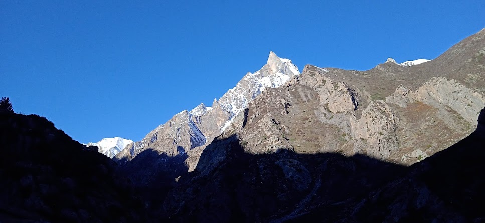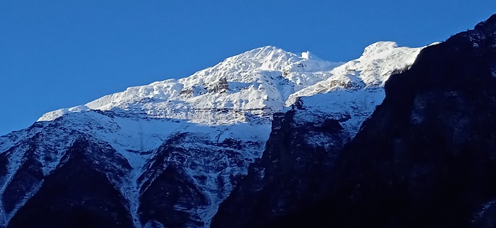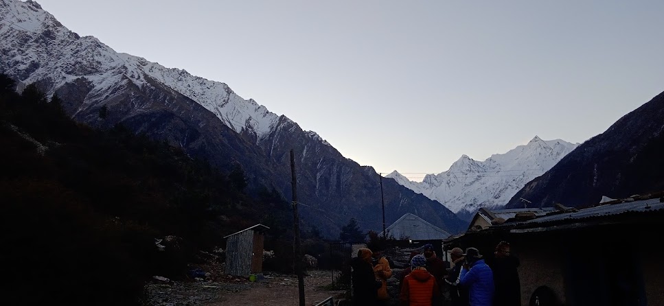 २९ अक्तूबर की रात गूंजी में सभी के लिए कठीन रही! एक तो अत्यधिक ठण्ड थी, साथ ही ऊँचाई लगभग ३३०० मीटर होने के कारण साँस लेने में भी कुछ दिक्कत हो रही थी| इसी कारण सोते समय कंबल सिर के उपर लेना सम्भव नही था, उसमें खतरा था| सभी लोग एक ही कमरे में अधिकसे अधिक कंबल आदि ले कर सोए| कितने अप्रत्याशित जगह पर हम है! और बिल्कुल भी अनप्लैन्ड तरीके से! लेकीन यह भी सच है कि अगर प्लैन किया होता तो शायद हम आते ही नही| क्यों कि सभी लोग उस अर्थ में घूमक्कड़ या ट्रेकर नही हैं| टूरीस्ट ही हैं| इसीलिए प्लैन नही किया, इसी लिए आ पाए| सभी लोग एक ही कमरे में होने से कुछ गर्मी मिली और छत लकड़ी का होने से भी लाभ मिला| हालांकी ठीक से नीन्द किसी की भी नही हुई| भोर होते होते सब जग गए थे| यहाँ के भोर का आकाश छूट न जाए, इसलिए मै बाहर आया! चाँद आसमाँ में आया है और उसकी रोशनी में पास के शिखर अच्छे से चमक रहे हैं| बादल है, इसलिए तारे उतने ज्यादा नही दिखे| लेकीन ठण्ड से उंगलियाँ जैसी ठिठुर गई हैं| और उससे भी बड़े मज़े की बात तो होटल के द्वार के पास रखी हुई बकेट का पानी जम गया है!! रात में होटलवाले ने थोड़ा दूर होनेवाला बाथरूम दिखाया था| वहाँ अन्दर प्लास्टीक के ड्रम का पानी लेकीन नही जमा है| उस ठण्ड में ब्रश करना भी टेढ़ी खीर है| जैसे तैसे अनिवार्य चीज़ें निपटा दी| कुछ मिनटों तक उंगलियाँ अकड़ सी गई थी| और साँस छोड़ना तो जैसे धुम्रपान ही बन गया है|