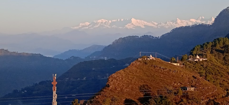 अगले दिन २८ को सुबह प्रदीपजी के साथ निकला| पास ही एक मन्दिर है| वहाँ जाना है| कल जो उतराई थी, अब वह सुन्दर चढाई है| भोर की ठण्ड होने पर भी चढाई पर चलते हुए गर्मी मिलती गई| बुंगाछीना गाँव से ही उस तरफ सड़क निकलती है| जैसे जैसे सड़क उपर उठती गई, पास का परिसर दिखाई देने लगा| कुछ आगे जाने के बाद तो सुदूर पहाड़ों में छीपे बर्फ शिखर भी दिखाई देने लगे! और सुबह की ताज़ी धूप में वे बिल्कुल लाल दिखाई दे रहे हैं! अद्भुत! मन्दिर के पास जाने पर और भी हिमशिखरों की माला दिखी| आस पास के गाँव और सड़कें भी दिखाई देने लगी| कुछ देर तक मन्दिर के पास बैठ कर इन नजारों का लुत्फ लिया| एकदम से प्रदीपजी ने बताया कि देखो, सामने लोमड़ी हैं| दो लोमड़ी थी| बाद में एक लोमड़ी तो हमें ही देख रही है| बहुत देर तक वह सामने रूकी रही| उसका विडियो लिया, लेकीन कैमरा ठीक से ऑन ही नही हो पाया| थोड़ी देर बाद हम जिस सड़क से आए हैं, उस पर भी एक लोमड़ी दिखी| उसका फोटो ले पाया| यहाँ घने पेड़ हैं और लगातार पहाड़ है| इस कारण वन्य पशु यहाँ आते रहते हैं| शेर भी अक्सर दिखाई देता है| उतरने के समय सूरज और उपर आया है और उससे शिखर और स्पष्ट दिखाई दे रहे हैं!