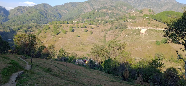 सुन्दर दृश्यों का आनन्द लेते हुए और फोटो खींचते हुए आगे बढ़े| चढाई के कारण ठण्ड भी महसूस नही हो रही है| बीच में एक गाड़ी क्रॉस हुई| बाद में घास ढोनेवाली एक दिदी भी मिली| यहाँ के लोग इतने सरल और प्रकृति- सम्मुख हैं कि वे एकदूसरे के बहुत करीब रहते हैं| उन्होने हमसे बात भी की| अदू को उठा कर ठीक से चल नही पा रहा हूँ| जब मन्दिर और पहाड़ बिल्कुल सामने आए, तब उसे कहा कि देखो अब अपनी शक्ती लगाओ| ताकत लगाओ| बस इतना सा चलो तो वापसी में पूरी ढलान ही तो है| तब वह तैयार हुई| यह सड़क आगे दूसरे गाँव भी जाती है| मन्दिर के पास पहुँचे| थोड़ी देर वहाँ रूके| पीछली बार यहीं से लोमड़ी दिखी थी, ऐसा उसे बताया| बस्ती पास में होने पर भी यह परिसर वीरान है| इसलिए ज्यादा देर रूके नही| उतरते समय भी उसे थोड़ी देर उठाना पड़ा| लेकीन एक शानदार ट्रेक हुआ|