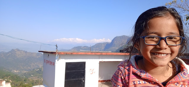 सुबह की ठण्डक में निकले| बुंगाछीना की ऊँचाई सत्गड से थोड़ी कम है, इसलिए ठण्ड में मामुली कमी है| अदू बड़े जोश से चलने के लिए तैयार हुई| निकलते समय ही उसे कहा था कि तुम्हे घूमाने ले जाऊँगा, लेकीन मेरी एक शर्त है| शर्त यह की गोदी में बिल्कुल नही उठाऊँगा! उसने भी हाँ भरी थी और हम निकल गए| हिमालय के इतने बीचोबीच बंसा अग्न्या- बुंगाछीना गाँव और उपर उठनेवाली पैदल राह! थोड़े ही समय में मेन रोड़ पर पहुँचे| कुछ ही दिन पूर्व प्रदीपजी के साथ आने के कारण सड़क परिचित है| सिर्फ पगडण्डियों से नही जा सकूँगा, क्यों कि वहाँ तो जानकार साथी चाहिए होता है| अदू की रफ्तार से मज़े से चलते रहे| धीरे धीरे घाट जैसी चढाई शुरू हुई और दुकान- घर पीछे रह गए| थोड़ा उपर चढ़ने पर पीछे मूड़ कर देखा तो सुबह की सुनहरी धूप में जगे हुए हिमशिखर दिखे! सड़क जैसे उपर जा रही है, वैसे वे और उपर उठ रहे हैं और शानदार ढंग से चमक भी रहे हैं| अदू बहुत एंजॉय कर रही है! लेकीन ये क्या! मुझे शर्त तोड़नी पड़ी! क्यों कि उसने चलने से मना कर दिया| थोड़ा रूकेंगे, ब्रेक ले कर चलेंगे कहा, लेकीन उसने सुना नही! फिर जैसे तैसे उसे उठा कर धीरे धीरे आगे बढ़ता गया| उसे उठा कर चलना अब बहुत मुश्कील वेट ट्रेनिंग बन गया है!