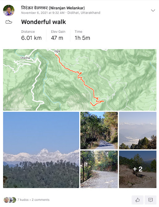 घण्टे भर का सुन्दर ट्रेक हुआ और ओगला पहुँच गया| बाकी लोग बाद में गाड़ी से आए| लौटते समय सत्गड में ठहरने के बजाय पिथौरागढ़ में एक रिश्तेदार के यहाँ आए| दोपहर थोड़ा आराम हुआ| बाद में बाकी लोग शॉपिंग के लिए गए| मुझे जानना था कि पिथौरागढ़ में ट्रेकिंग़ के लिए अच्छी जगह कौनसी है| तब पता चला कि यहाँ चण्डाक हिल एक अच्छा स्थान है| बहुत प्रसिद्ध जगह है| तब वहीं जाना तय किया| शाम को पिथौरागढ़ में थोड़ा टहला| यहाँ ठण्ड तो हमेशा ही होती है| लेकीन अत्यधिक ठण्ड के दो- तीन महिने होते हैं| अर्थात् यहाँ भी अब पहले के मुकाबले बर्फ बहुत देरी से और कम गिरती है| पहले तो दिसम्बर में बर्फ गिरती थी| अब लोग बताते हैं कि जनवरी में थोड़े दिन ही गिरती है और कम भी गिरती है| लेकीन ठण्ड तो होती ही है| इसलिए घर घर रूम हीटर हैं| इसके साथ घरों की दिवारे भी मोटी होती है| शहर देखते समय इस फर्क तुरन्त पता चलता है| यहाँ घूमते समय ॐ पर्वत का पोस्टर ढूँढ रहा हूँ, लेकीन कहीं पर भी मिल नही रहा है| अब कुछ ही दिनों में वापस लौटना है| लेकीन उसके पहले जितना सम्भव होगा, जरूर घूमता रहूँगा|