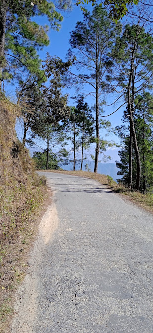पंचचूली और अन्य शिखर दिखाई दे रहे हैं| प्रकृति इतनी सुन्दर है कि यहाँ सिर्फ चलना नितान्त सुखद है| बिल्कुल सुनसान सड़क, खाली आकाश और रमणीय नजारे! और क्या चाहिए! मनचाहे फोटो खींचता हुआ जाता रहा| दूर के गाँव भी दिखाई दे रहे हैं| दूर से दिखनेवाला अस्कोट पहचान सका| पहाड़ के बीच बीच के पीले दाग़ लैंडस्लाइड का स्मरण करा रहे हैं! सड़क जैसे मूड़ती हुई जा रही है, वैसे सुदूर के हिमशिखर भी अलग अलग कोणों से दिखाई दे रहे हैं| वास्तव में बहुत बड़ा सुख है यह| इसके लिए भी शायद किस्मत ही चाहिए| बीच बीच में छोटे गाँव लग रहे हैं| घर सड़क की नीचे की तरफ हैं, इसलिए एक घर का छत सड़क से सटा दिखा| आगे देवदारों का सुन्दर वन लगा| वैसे तो यह सब वन ही है| इसलिए रात में कोई अकेले पैदल नही जाता है| हिमालय के चरण कमलों से शुरू होनेवाला पहाड़! अनगिनत मोड़, असंख्य पहाड़ की पंक्तियाँ और खाई- इनमें से होनेवाली उसकी यात्रा और हिमशिखर का चरम बिन्दु! हिमालय का यह पैमाना, हिमशिखरों की ऊँचाई में भी उसके चरण तल के साकार रूप को देखते समय अध्यात्म याद आया| साधना भी ऐसी ही तो होती है| निम्न स्तर के असंख्य अनुभव, अनगिनत मोड़ और चढाई- उतराई के साथ आगे जाती है| वह भी तो एक ऐसा ही शिखर है ना! खैर|