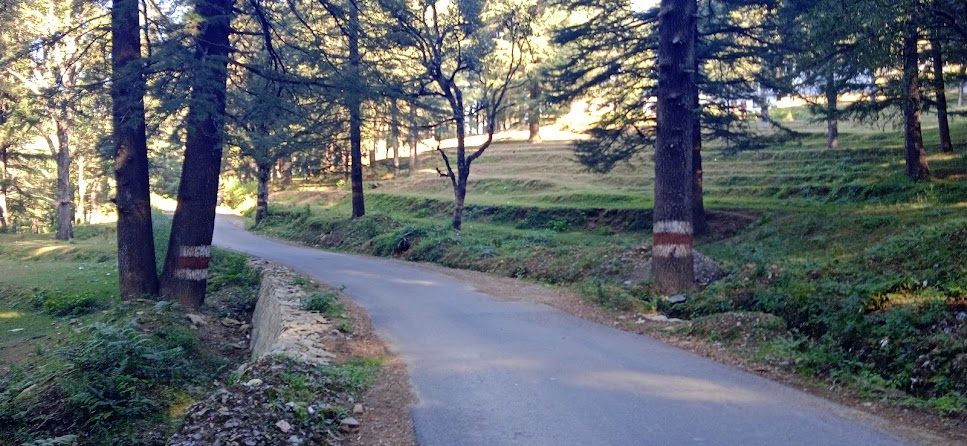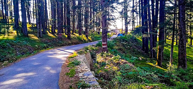 यहाँ से कुछ मन्दिरों के लिए पगडण्डी भी निकलती है| यहाँ प्रादेशिक सेना की निगरानी में बना एक पर्यावरण पार्क भी दिखाई दिया| कुछ मोड़ ले कर सड़क अब पहाड़ी पर पहुँच गई| सब तरफ देवदारों का साम्राज्य! छह किलोमीटर हुए हैं, लेकीन थकान बिल्कुल भी नही है| क्यों कि मै प्राकृतिक एसी के आल्हाददायक वातावरण में ही तो चल रहा हूँ| साथ में नजारे इतने अनुठे हैं कि थकान का सवाल ही नही है| यहाँ घूमने आने का निर्णय लेने के लिए खुद को बार बार धन्यवाद दे रहा हूँ! सामने कुछ दूरी पर मोबाईल टॉवर दिखाई दे रहा है| अर्थात् इस हिल का यही माथा होगा| आगे सड़क शायद थोड़ी नीचे उतरेगी| यहाँ कुछ बस्ती मिली| लेकीन पराठे का होटल नही मिला, इसलिए आगे बढ़ा| यहाँ से चण्डी मन्दिर और मोस्ता मानूू मन्दिर के मार्ग अलग होते हैं| मोस्ता मानूू मन्दिर की तरफ मूड़ा और बस्ती जैसे ही पीछे गई, देवदारों का घना वन मिला! अद्भुत- सपने जैसा दृश्य! मै मज़ाक में इन दिनों मेरे दोस्तों से कह रहा हूँ कि मै बहुत अय्याश हुआ हूँ| निरंतर मज़े लूट रहा हूँ! इतने करीब से देवदारों का सत्संग और उनके पीछे छुपे हिम शिखर! जल्द ही मोस्ता मानू मन्दिर में पहुँचा| यह शिव मन्दिर जैसा मन्दिर है| आसपास थोड़े घर और दुकान| कुछ देर मन्दिर में शान्त बैठा और वापस निकला|