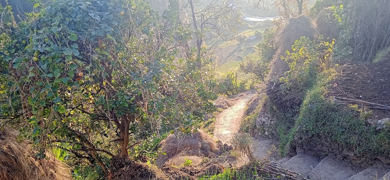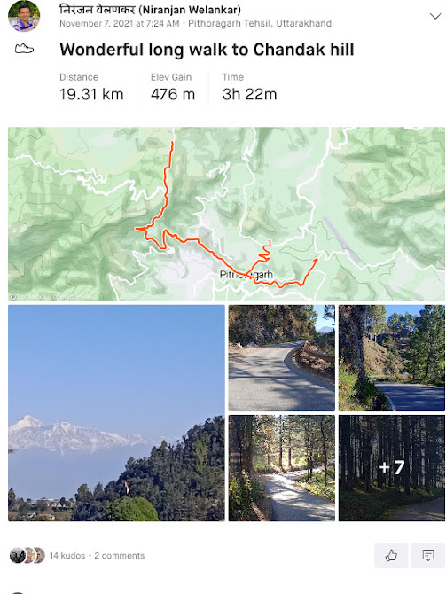 उनका घर पिथौरागढ़ में दूसरी तरफ है| रास्ता ढूँढते ढूँढते गया| कुछ लोगों ने शॉर्ट कट बताया| यह तो पगडण्डी थी जो शहर के बीचोबीच की गलियों से जा रही हैं| कहीं कहीं पर तो वह पहाड़ के पास से और खेत के पास भी जा रही है| पिथौरागढ़ को अन्दर से देख रहा हूँ| पगडण्डी का अपना अलग मज़ा होता है| यहाँ वैसे भी सब तरफ नजारे ही नजारे और ट्रेक हैं ही! जब उनके घर पहुँचा तब कुल १९ किलोमीटर हुए हैं| चलने का समय ३ घण्टे २२ मिनट| थकान इतनी ही है कि ठण्ड नही लग रही है! बाद में वहाँ से फिर मार्केट में आते समय एक किलोमीटर चला| शाम को सत्गड पहुँचने पर वह भी छोटा ट्रेक हुआ| कुल मिला कर दिन में २१ से अधिक किलोमीटर हुए| एक बिल्कुल अनुठी हाफ मैरेथॉन ही हुई! दूसरे दिन का मेरा प्लैन तैयार किया| बुँगाछीना से कनालीछीना होते हुए जब सत्गड आए थे, तो वह सड़क बहुत पसन्द आयी थी| कल उसी सड़क पर २५ किलोमीटर चलूँगा| पहले सोचा कि बुँगाछीना तक जाऊँगा और वापस जीप से आऊँगा| लेकीन फिर लगा कि उसमें समय जाएगा| जीप जल्दी मिलेगी ही ऐसा नही है और पैसे भी लगेंगे! इसलिए सोचा कि उसी सड़क पर आधी दूरी तक जाऊँगा और वहीं से लौटूँगा| उस सड़क पर भी घूमना हो जाएगा, समय भी बचेगा और पैसे भी बचेंगे! वह ट्रेक भी अत्यधिक सुन्दर रहा| उसके बारे में अगले भाग में बात करता हूँ|