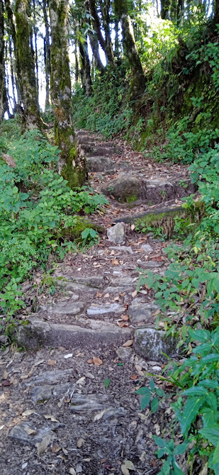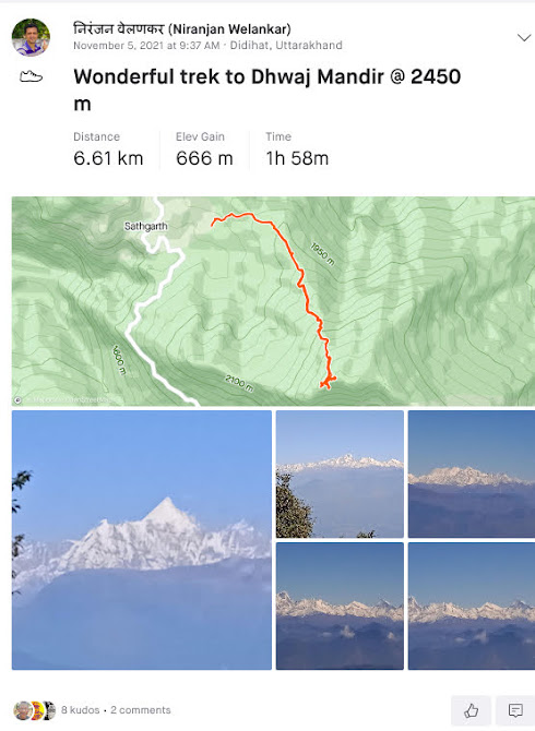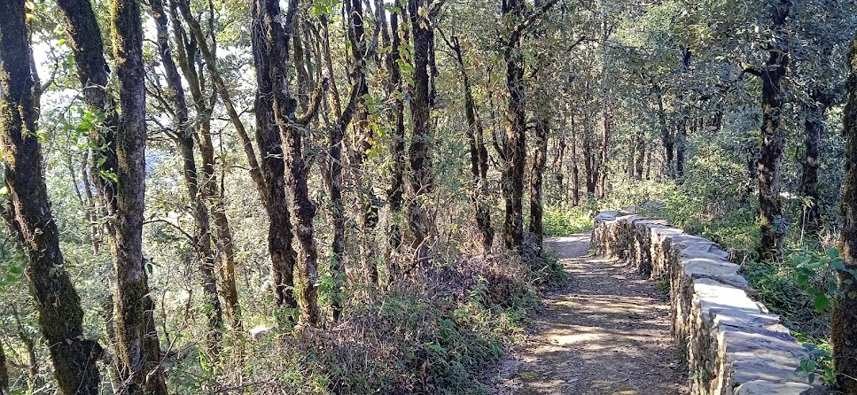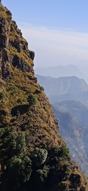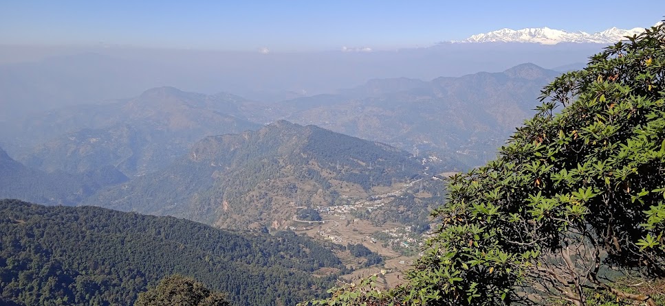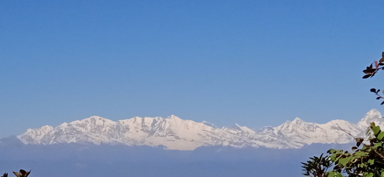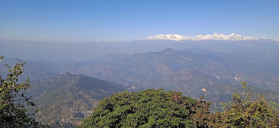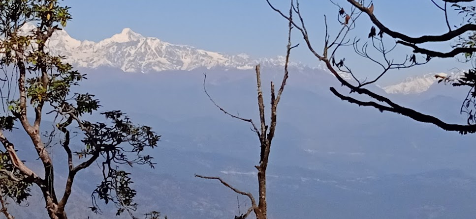 जैसी पगडण्डी उपर उठती गई, दूर के नजारे उभरने लगे| २०१७ में आया था, तब आकाश इतना स्पष्ट नही दिखाई दे रहा था| इसलिए दूर के हिम शिखर ठीक से नही दिखे थे| लेकीन अभी वे अत्यधिक सुन्दर दिखाई दे रहे हैं| अवाक् करनेवाला अनुभव! उसके साथ वृक्षों का घना जंगल और भरी दोपहरी में ठण्ड और अन्धेरा! बीच में अचानक कुछ आवाज आयी| एक सेकैंड के लिए शेर का डर लगा| लेकीन वह पंछी था| फोटो खींचते खींचते आराम से सवा घण्टे में मन्दिर के पास पहुँच गए| यहाँ तीन मन्दिर हैं| एक गुफा भी है| वहाँ भी गए| यहाँ रहनेवाले साधु बाबा दिखाई नही दिए| कुछ अन्य लोग दिखे| लगभग सौ स्टेप्स को चढ कर सबसे उपर के मन्दिर में पहुँचे| यहाँ बड़ी घण्टा बजायी| वह सत्गड़ में भी सुनाई देती है| अद्भुत दृश्य! एक तरफ नजरों में न समेटनेवाली हिमशिखर की माला! एक दृष्टिक्षेप में न समानेवाली पर्वतों की माला! नीचे सत्गड और बाकी गाँव| दूर पतली रेखाओं जैसे तिरछे रास्ते और हिमशिखर! विहंगम! और कई जगह पर लैंडस्लाईड के भी निशान| बहुत बड़ा प्रदेश दिखा दे रहा है! और यहाँ मोबाईल ने नेपाल का नेटवर्क पकड़ा| क्यों कि यहाँ से नेपाल सीमा पास ही है| कुछ मिनट तक ध्यान किया और वापस मूड़े| नीचे एक छोटा मन्दिर है| आदित्य ने मुझे बताया कि उसे इस मन्दिर में डर लगता है| क्यों कि मन्दिर से छत की तरफ देखने पर छत बहुत ऊँचा लगता है और बाहर से तो वह छोटा लगता है! और ऐसा लग भी रहा है!