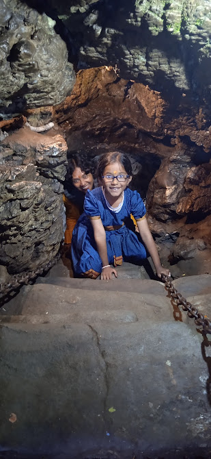 गुफा में उतरते समय एक गाईड साथ में है| गुफा में जाते समय भी पत्थरों के बीच ही उतरना पड़ा| रॉक क्लाइंबिंग! ९० फीट गुफा की गहराई है| अन्दर कई छोटी गुफाएँ/ कमरें हैं और उनकी भी कई कहानियाँ सुनने को मिली| अन्दर की सतह गिली है, इसलिए फिसलन का खतरा लगा| जमीन के नीचे जाने का अनुभव रोमांचकारी लगा| लगभग आधे घण्टे तक गुफा में अलग अलग जगहों पर गाईड ने घुमाया| किसी को भी साँस लेने में दिक्कत नही आयी| सिर्फ कहीं कहीं फिसलन का डर लगा| चढ़ते समय का रॉक क्लाइंबिंग अदू कैसे करेगी, यह सन्देह मन में था| उतरते और चढ़ते समय भी एक लोहे की रस्सी आधार देने के लिए है, फिर भी पैर रखने में जगह कम है| लेकीन अदू ने यह रॉक क्लाइंबिंग बड़ी आसानी से और जोश से किया! अन्दर क्या है, कैसे जाना है और क्या देखना है, यह बाहर से पता नही चलता है और इससे यह मन्दिर देखना रोमांचक लगा| हल्का सा तनाव भी लगा और बाहर आने पर एकदम राहत मिली| सत्गड में साथ क्रिकेट खेलनेवाला और ध्वज मन्दिर पर आनेवाला आदित्य यहाँ पर नही आया था| वह गेन्दबाज़ी करते समय (और बल्लेबाज़ी के समय भी) खुद को बुमराह कहता था| देखो बुमराह की बॉलिंग, कहता था! इसलिए भुवनेश्वर को मिलते समय बुमराह को ज़रूर मिस किया!