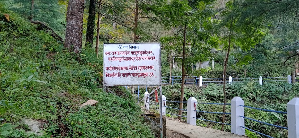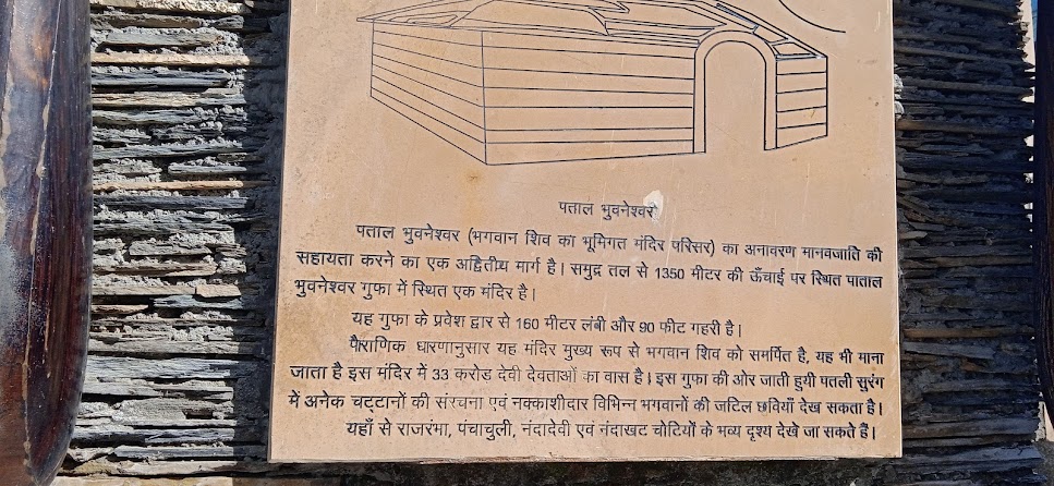 लगभग दोपहर १२ बजे पाताल भुवनेश्वर पहुँचे| इस छोटे से स्थान पर अब बहुत से रेसॉर्टस और दुकान आदि खुल गए हैं| साथ में होनेवाले जितूजी ने मन्दिर की काफी जानकारी बतायी कि यहाँ अन्दर हवा कम है जिससे छोटे बच्चों को साँस लेने में दिक्कत हो सकती है| यहाँ ३३ करोड़ देवताएँ रहती हैं, यहाँ से भूमिगत राह सीधा बद्रीनाथ- केदारनाथ तक जाती है, पाताल भुवनेश्वर देखने से चार धाम यात्रा का पुण्य मिलता है आदि आदि| मन्दिर के परिसर में भी इसी तरह के विवरण दिखे| मन्दिर के भीतर गुफा में कई जगह पर पत्थर से बनी रचनाएँ, गुफा में बहनेवाली जल धाराएँ, अन्दर की संरचना आदि को ले कर सैकड़ों मान्यताएँ हैं कि यहाँ सब देव वास करते हैं, यहीं पर ब्रह्मदेव आए थे आदि| इन सब बातों को वहीं छोड़ दिया| लेकीन एक प्राकृतिक और रमणीय स्थान के तौर पर यह गुफा बिल्कुल एंजॉय करने जैसी है| पास का परिसर भी सुन्दर है| सुदूर हिमशिखर लगातार साथ देते हैं|