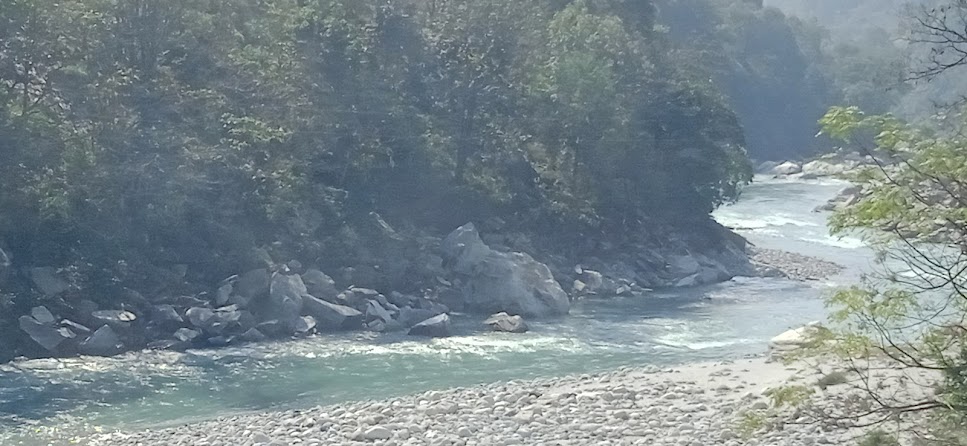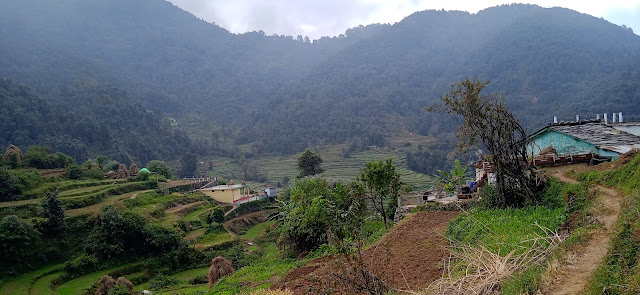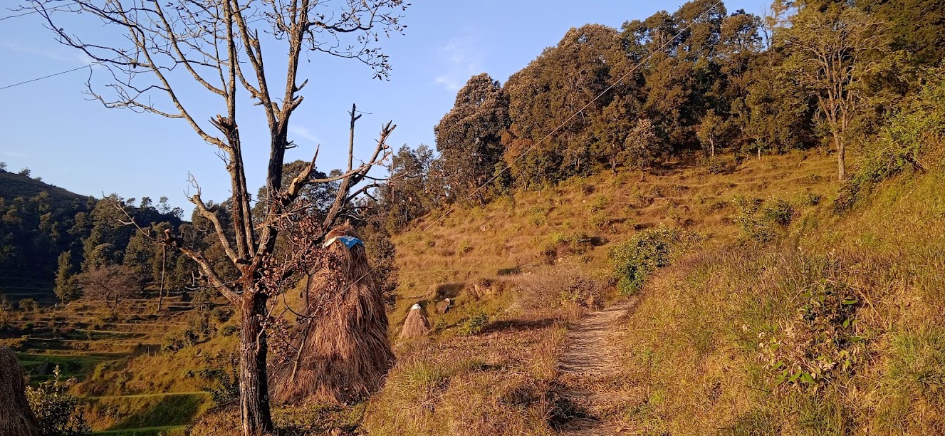 अदू अक्सर यहाँ पैदल चलती है| लेकीन आज थकान के कारण वह उठाने को कह रही है| थोड़ी देर मैने और उसकी माँ ने उसे उठाया और चलते रहे| थोड़ा रूकते रहे और उसे भी चलाते रहे| धीरे धीरे ऐसे करते हुए वह चढाई पार हुई| इतना चल चुके, अब थोड़ी ही चढाई बाकी है, अब आसान पगडण्डी है, ऐसा कहते हुए उसे भी चलाया| मज़े की बात तो यह थी कि हमारे सत्गड के रिश्तेदार उसे आराम से कन्धे पर बिठा कर हाथ में वजनी सामान ले कर भी चल पाते हैं| अगर वे अभी साथ होते, तो उसे मुस्कुराते हुए कन्धों पर रख कर चल जाते| और दूसरी मज़े की बात यह कि एक बार खेलने के दौरान अदू ने मेरा हाथ उनके हाथ के पास रखा था| तब मेरा हाथ तो बहुत छोटा नजर आया, एकदम ही छोटा! उनका हाथ बहुत बड़ा लगा, मेहनत से ढला हुआ! कुमाऊँ प्रदेश गोरखाओं के नेपाल के बहुत करीब है और कुमाऊँ लोग गोरखाओं के छोटे भाई हैं, इसका भी स्मरण हुआ! अब जल्द ही हिमालय से विदा लेना है! लेकीन अदू यहीं पर उसकी मौसी के पास रहेगी| उसे हिमालय का सत्संग और कुछ समय तक मिलेगा!