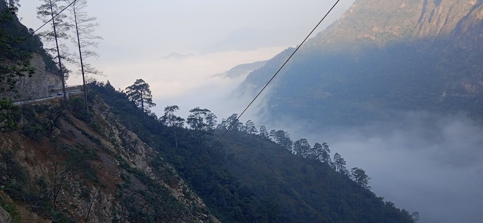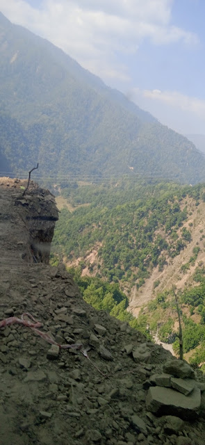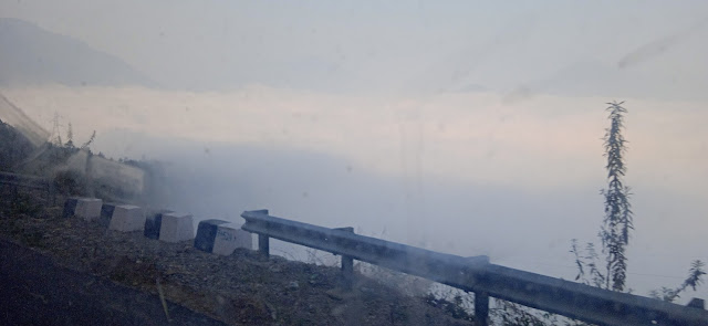 अगले दिन लगभग रात के अन्धेरे में ही सत्गड से नीचे उतरे| अन्धेरे में ही यह ट्रेक हुआ! सुबह साड़े छह की बस है| अदू अब शान्त है और कह रही है कि शायद यहीं वह ठहरेगी| सत्गड से पिथौरागढ़ आए और वहाँ टनकपूर की बस मिली| बाकी लोग टनकपूर के पास- हिमालय के बेस पर हैं| मै, अदू और अन्य कुछ लोग बस से निकले| यह छह घण्टों की बस यात्रा है! जब यह यात्रा पूरी होगी, तब हम हिमालय के बेस पर पहुँचेंगे और फिर से धरती माता से मिलना होगा! पिथौरागढ़ से निकलते निकलते सुबह की ताज़गीभरे माहौल में सड़क से सटी खाई में कोहरे का जैसे समुन्दर दिखाई दिया! वाकई, समुन्दर ही है! यह बस यात्रा भी कम रोमांचकारी नही है| कितने स्थानों पर सड़क अब भी टूटी है| कई जगहों पर पत्थर गिर रहे हैं| सब तरफ लैंडस्लाईड के निशान दिखाई दे रहे हैं| हिमालय उतरते समय भी लगातार लहराती- चढ़ती- उतरती सड़क! एक के बाद एक पहाड़ उतरने का अनुभव| यहाँ लोहाघाट नाम की जगह लगती है| पास में ही विवेकानन्द का मायावती आश्रम है| कभी अवसर नही आया वहाँ जाने का| आगे चंपावत में प्रसिद्ध बाल मिठाई ले ली| अब इन्तजार है धरती से मिलने का! हिमालय से लौटते समय जमीन के पास आने का अनुभव भी अनुठा होता है| पहले तो चारों ओर पहाड़ ही पहाड़ होते हैं| जहाँ नजर जाती है- पहाड़ ही पहाड़| लेकीन धीरे धीरे तीन तरफ पहाड़ दिखाई देते हैं और एक तरफ से गढ़्ढा जैसा हो जाता है| जब विजिबिलिटी अच्छी होती है, तो ४०- ५० किलोमीटर की दूरी से भी जमीन पर कोहरे का समुन्दर दिखाई देता है! हिमालय से नीचे आ कर जमीन से टच डाउन होना, यह भी एक ध्यान का क्षण है! एक सन्धि काल| टनकपूर पहुँच गए| टनकपूर के पहले भी एक जगह नदी पर का ब्रिज बहने के कारण सड़क अस्थिर बनी हुई थी| पहाड़ में जीवन कितना कष्टपूर्ण है, इसका ये सब सड़कें प्रतिक हैं|