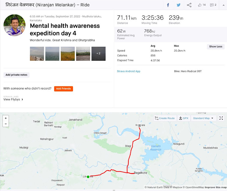 Forth day, 27th September! As I had ridden more 18 kms Yesterday, today's distance is small, just 63 kms! Today I will cross Bagalkote. One memory for our family is that my Grand father Narayan Welankar had worked in Bagalkote 80 years back, in 1942 as a RSS worker. So this village was known to me. I left Lokapur at 6:30 am. The road inside the village was ordinary, but once I crossed the village, the highway is as smooth as earlier. From Kudal- Goa- Belgavi- Lokapur and now towards Kolhar. Direction of the route is such that everyday I face the sun. There are no mountains after Belgavi. Flat terrains, spacious highway and glorious morning! As it is the fourth day, there are no nerves. Now cycling is almost on auto pilot mode. Like all days, I am having some interactions with the people on the road. Today I will cross two rivers and so I will have a slope.