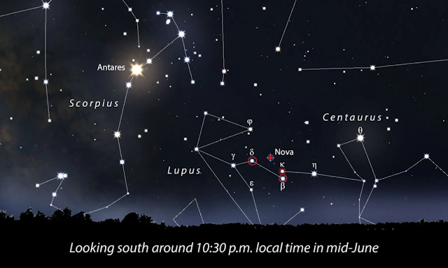 सुपरनोव्हा (अति नवतारा) म्हणजे तार्याचा स्फोट होण्याची स्थिती. तार्यांच्या जीवनक्रमामध्ये शेवट होण्याची एक शक्यता असा स्फोट ही असते. तार्यांचं युगुल (पेअर) असेल व एक तारा खुजा (ड्वार्फ) असेल किंवा तार्याचं वस्तुमान जास्त असेल तर असा स्फोट होतो. स्फोट झालेला तारा दक्षिणेकडच्या वृक म्हणजे ल्युपस (Lupus) तारकासमूहातला +22.3 प्रतीचा तारा होता. त्याचा स्फोट झाल्याचं 12 जूनला लक्षात आलं. आकाशाचा इलेक्ट्रॉनिक सर्व्हे करणा-या यंत्रणेने +22 म्हणजे अति अंधुक असलेला हा तारा 8.7 इतक्या प्रतीचा म्हणजे तेजस्वी झाल्याचं सांगितलं. आणि 19 जून रोजी त्याची तेजस्वीता वाढून 5.7 इतकी झाली म्हणजेच तो नुसत्या डोळ्यांनी दिसण्याच्या मर्यादेइतका तेजस्वी झाला आहे.